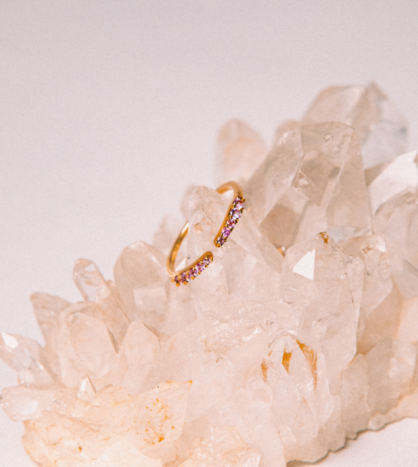 El Anillo Presili está elaborado en oro de 18k y zafiros rosas naturales, con un diseño fino y femenino. Los zafiros, con su tono suave y vibrante a la vez, evocan amor, alegría y confianza interior.