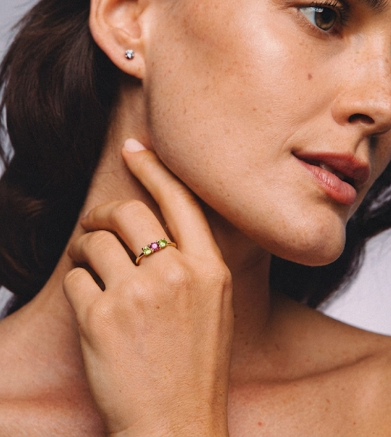 El Anillo Turqueta de plata de ley, turmalina rosa y peridotos, es una joya de diseño atemporal. Su estructura con tres gemas alineadas aporta equilibrio y simboliza conexión: contigo misma, con tu historia y con tu energía.