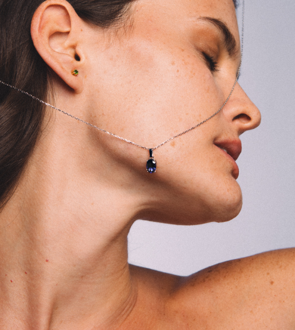 Colgante de oro blanco 18k con iolita natural. Una joya sutil y elegante, con reflejos azul-violeta que inspiran introspección. Elaborado artesanalmente en España. Incluye certificado gemológico.